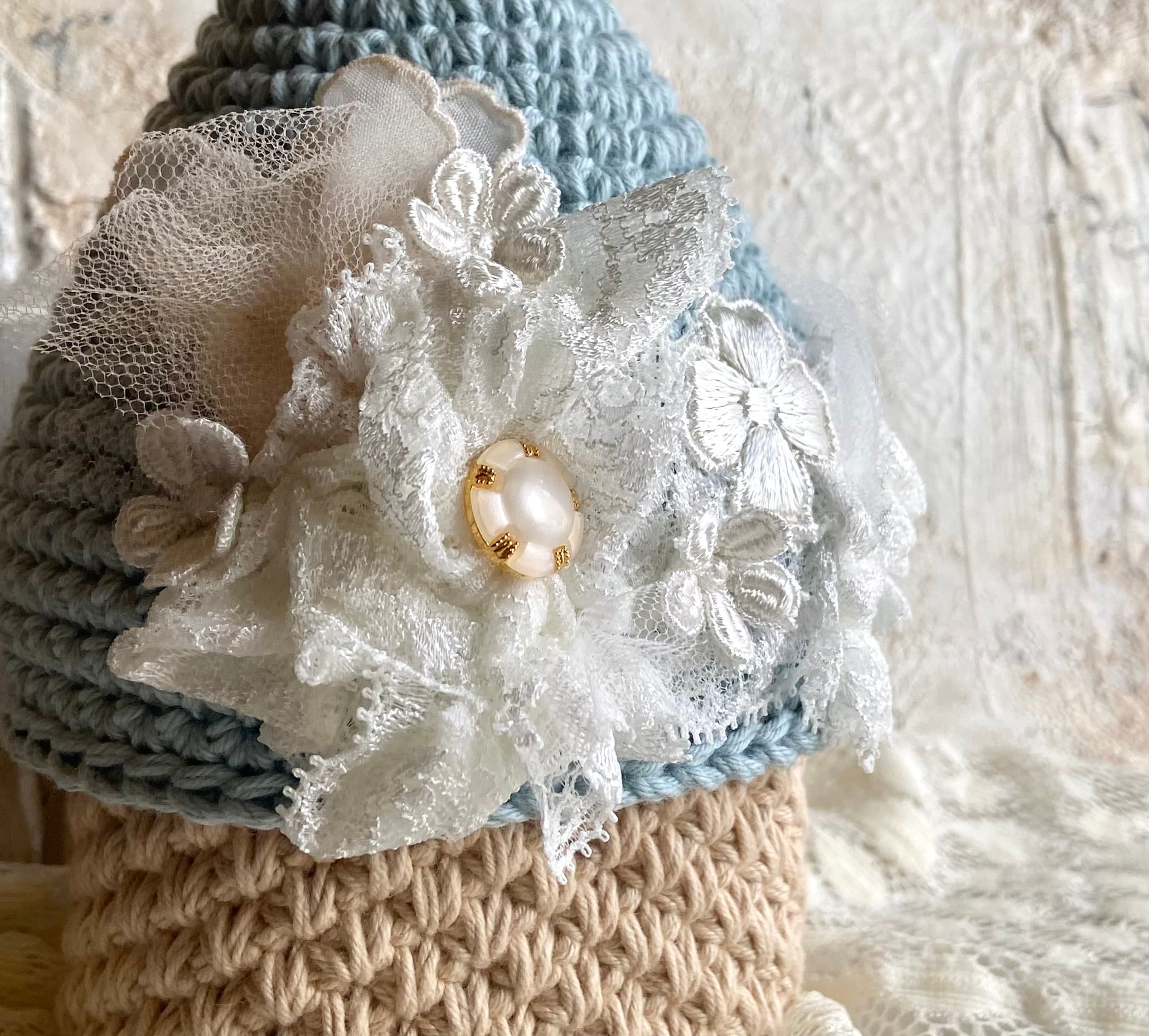 屋根部分をレースやボタンで飾って